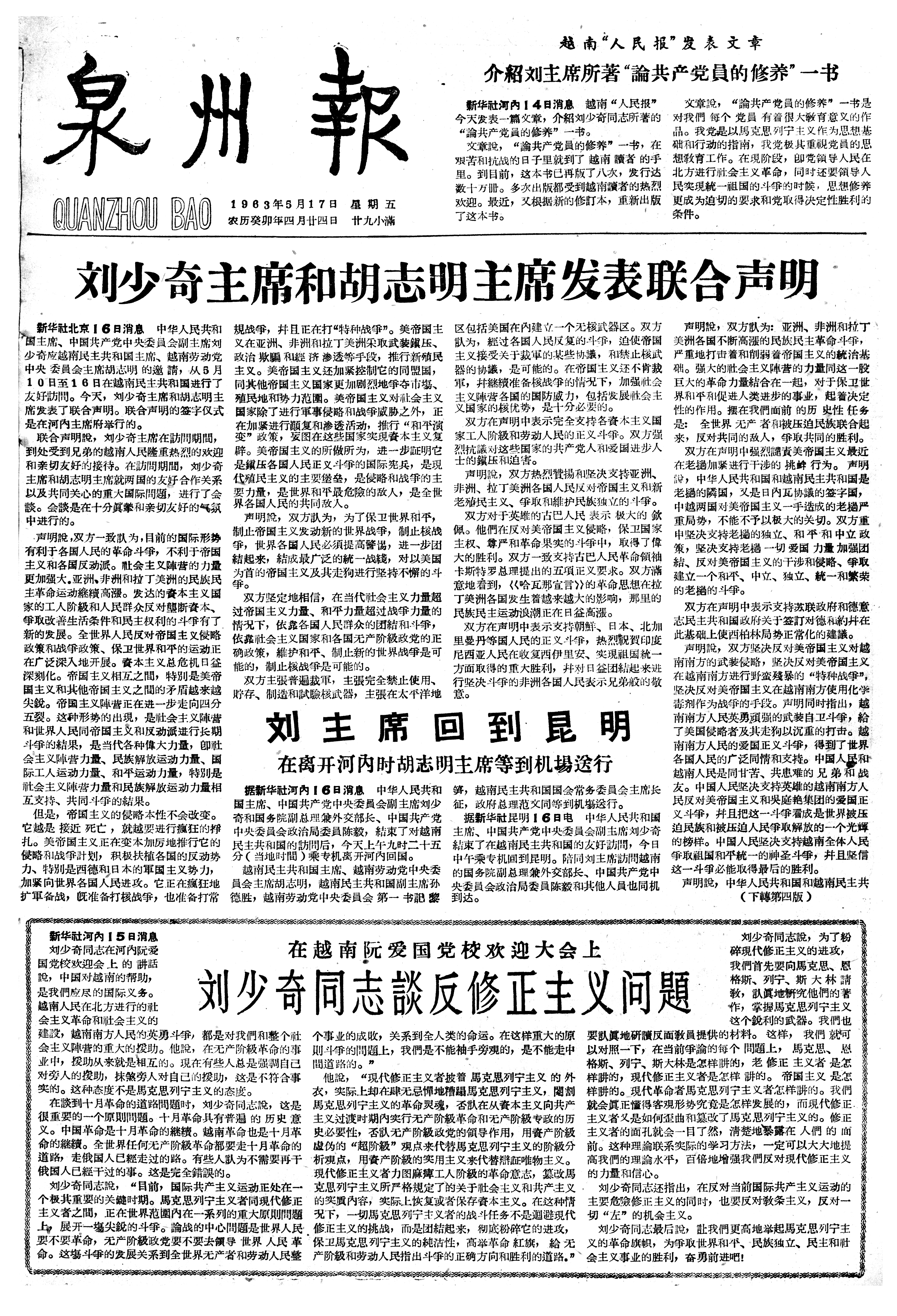 刘少奇主席和胡志明主席发表联合声明