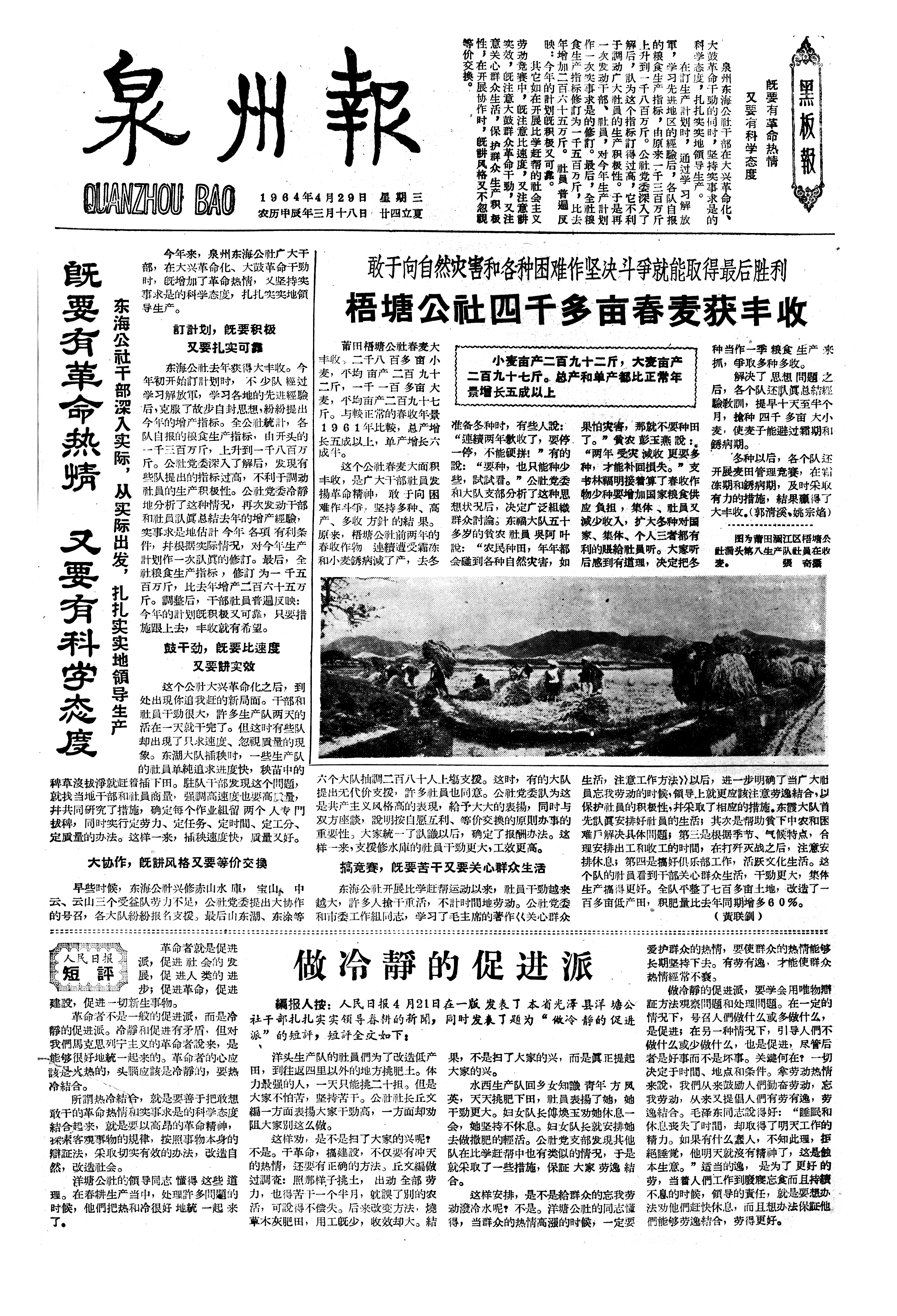 敢于向自然灾害和各种困难作坚决斗爭就能取得最后胜利 梧塘公社四千多亩春麦获丰收 小麦亩产二百九十二斤,大麦亩产二百九十七斤。总产和单产都比正常年景增长五成以上