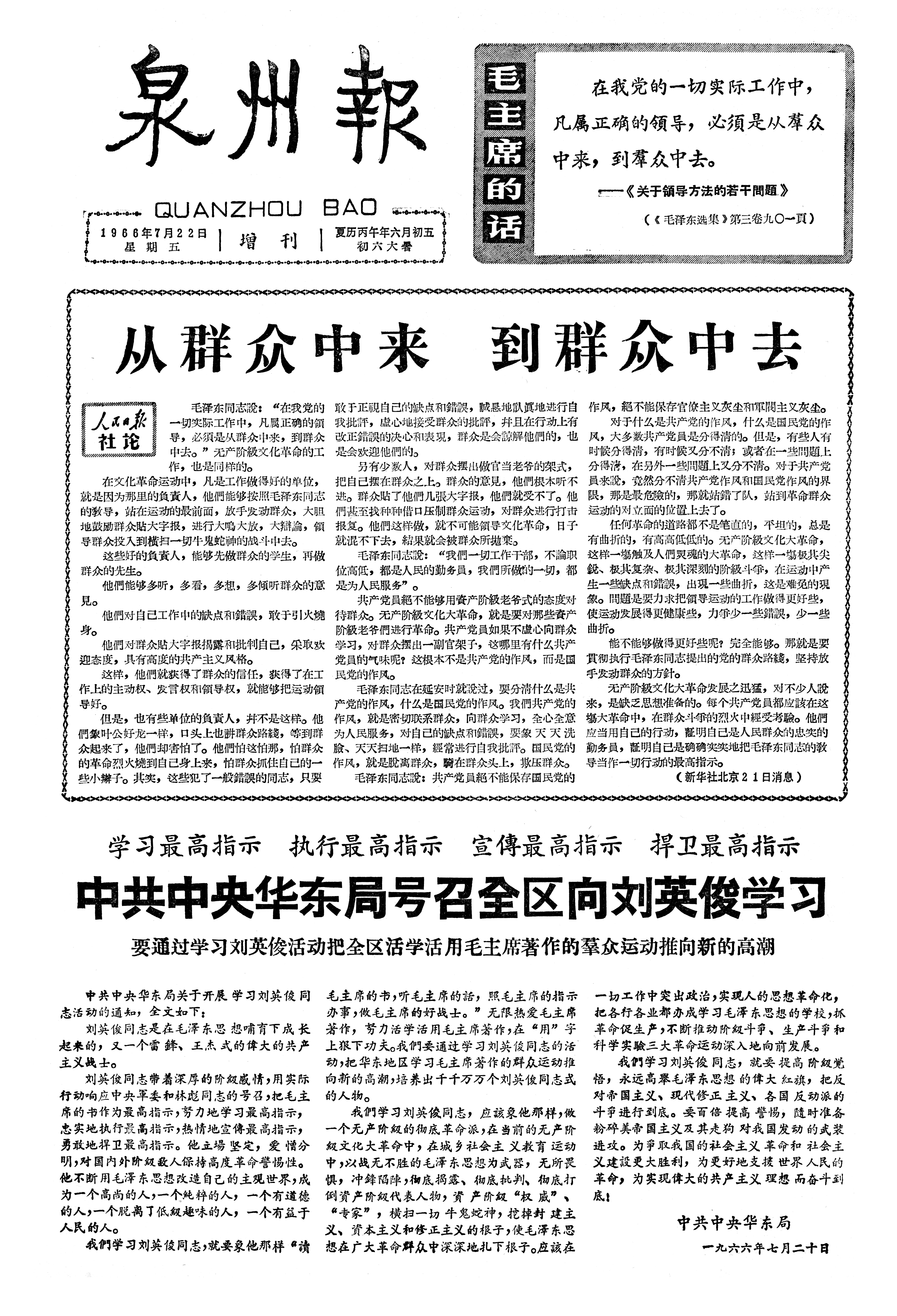 学习最高指示 执行最高指示 宣傳最高指示 捍卫最高指示 中共中央华东局号召全区向刘英俊学习 要通过学习刘英俊活动把全区活学活用毛主席著作的羣众运动推向新的高潮