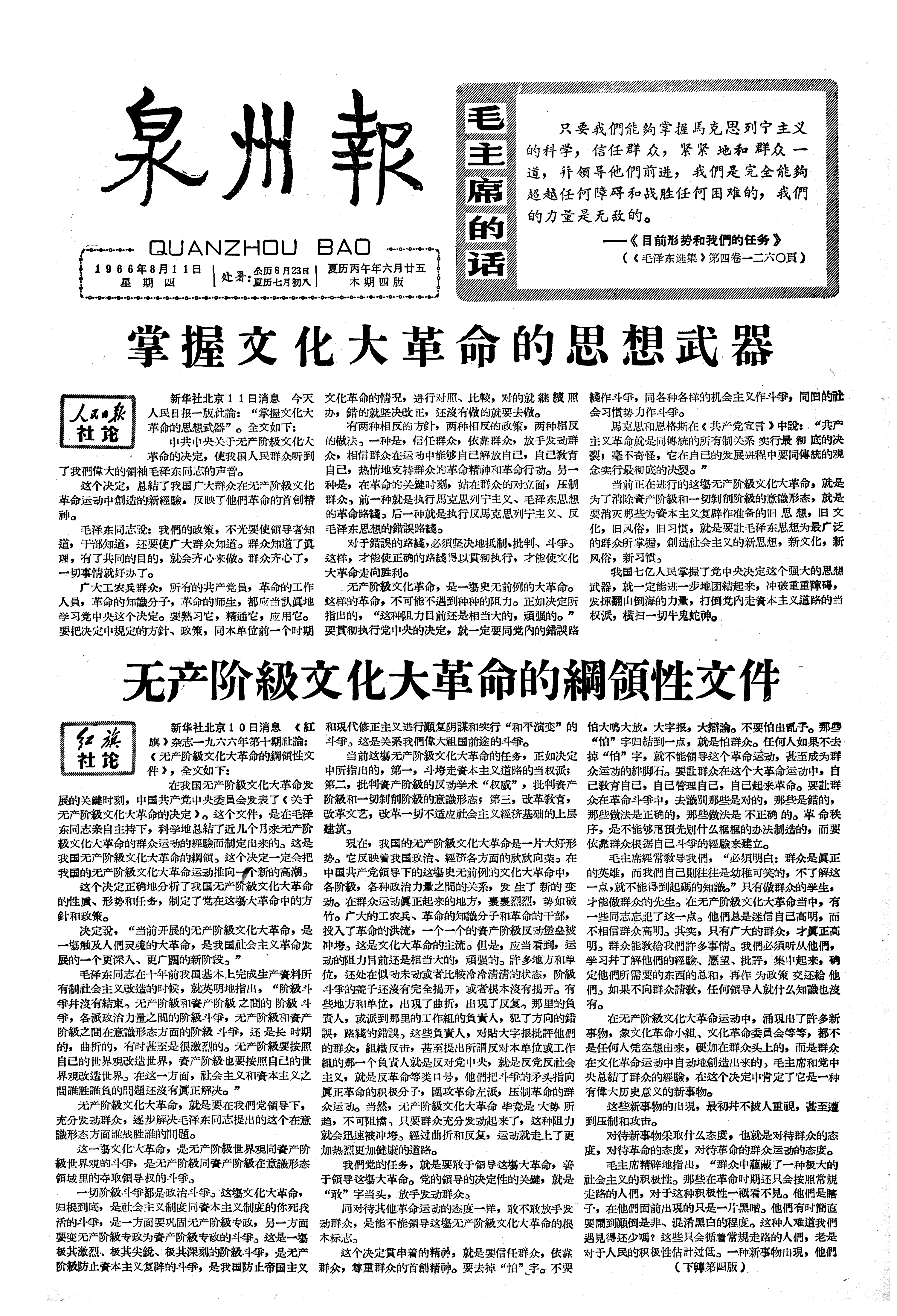 我区广大革命羣众和解放軍指战員热烈欢呼和坚决拥护党中央决定 高举毛澤东思想伟大红旗夺取文化大革命彻底胜利