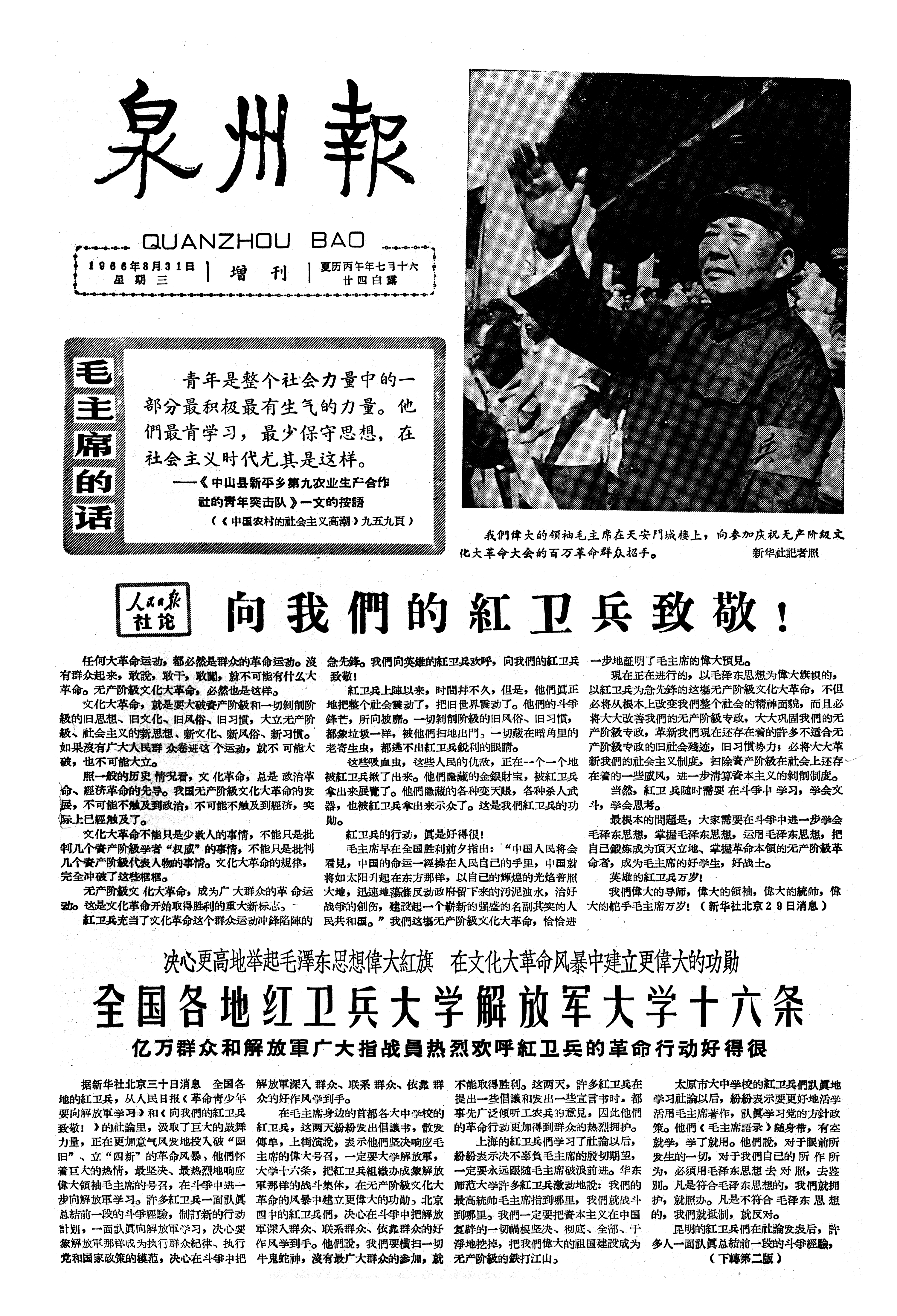 决心更高地举起毛澤东思想偉大紅旗在文化大革命风暴中建立更偉大的功勛 全国各地红卫兵大学解放军大学十六条 亿万群众和解放軍广大指战員热烈欢呼紅卫兵的革命行动好得很