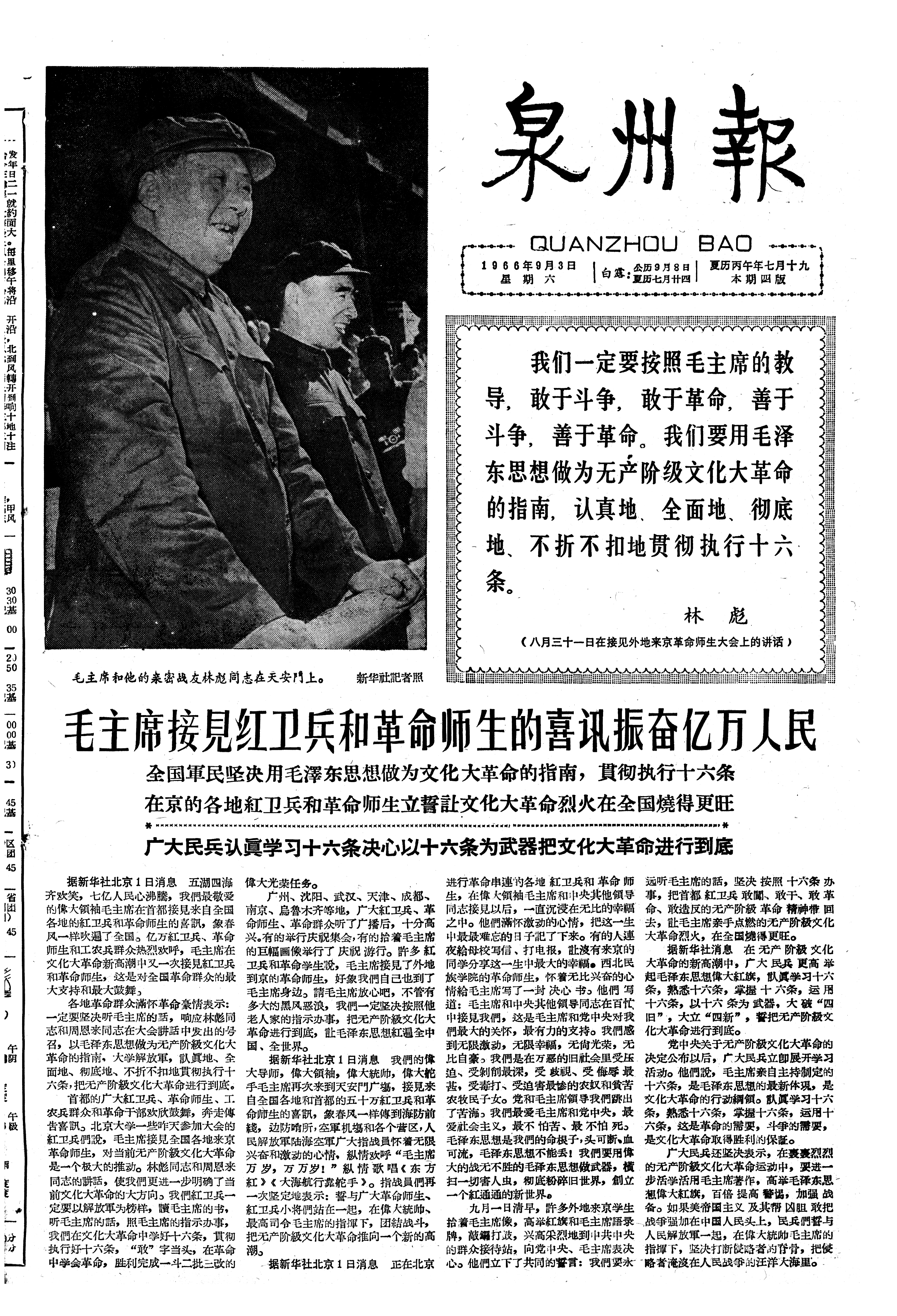 毛主席接見红卫兵和革命师生的喜讯振奋亿万人民 全国軍民坚决用毛澤东思想做为文化大革命的指南,貫彻执行十六条在京的各地紅卫兵和革命师生立誓让文化大革命烈火在全国燒得更旺广大民兵认眞学习十六条决心以十六条为武器把文化大革命进行到底
