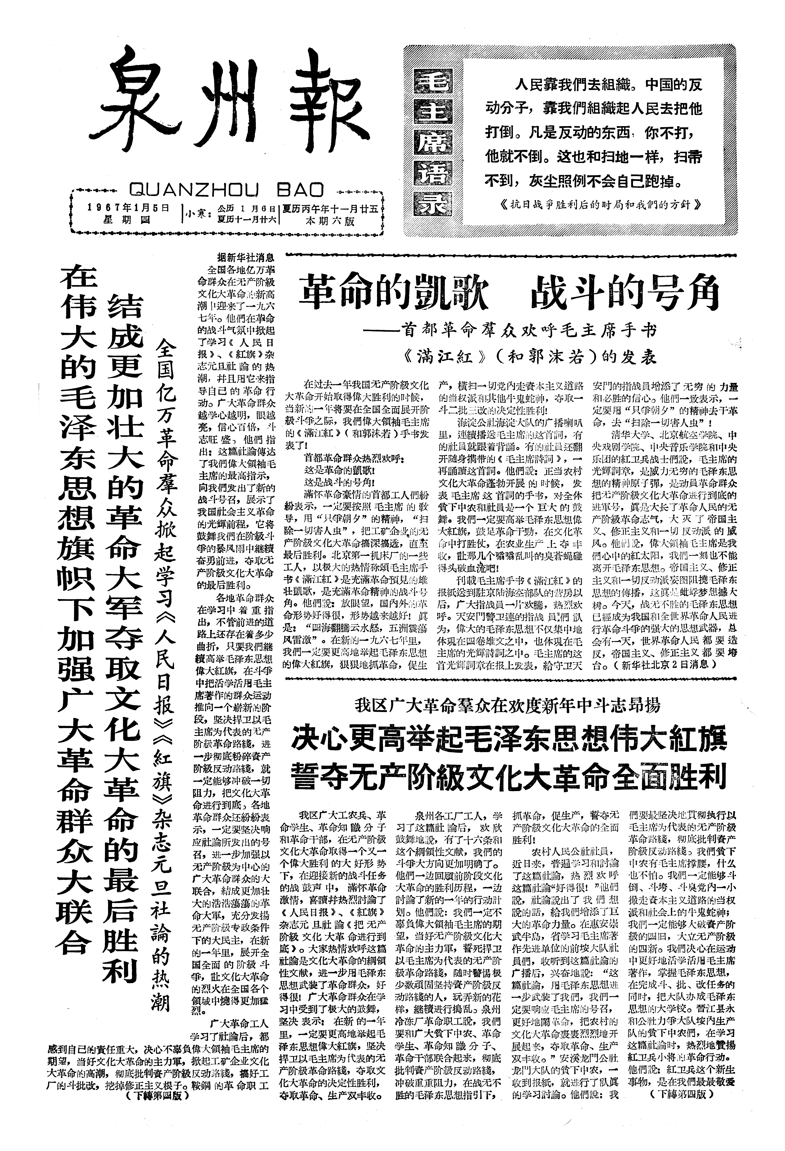革命的凱歌 战斗的号角 ——首都革命羣众欢呼毛主席手书《滿江紅》(和郭沫若)的发表