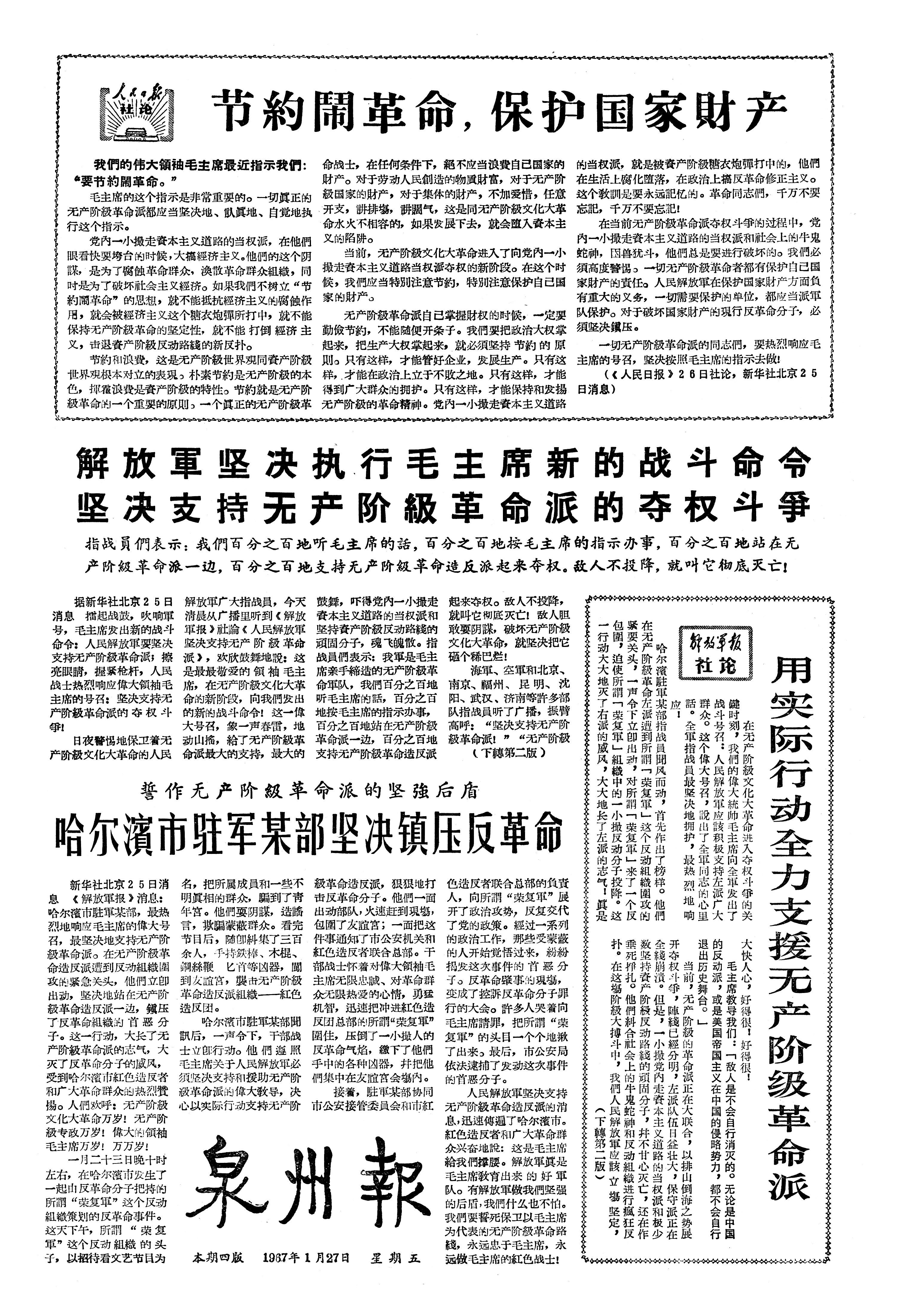 解放軍坚决执行毛主席新的战斗命令 坚决支持无产阶級革命派的夺权斗爭 指战員們表示:我們百分之百地听毛主席的話,百分之百地按毛主席的指示办事,百分之百地站在无产阶級革命派一边,百分之百地支持无产阶級革命造反派起来夺权。敌人不投降,就叫它彻底灭亡!