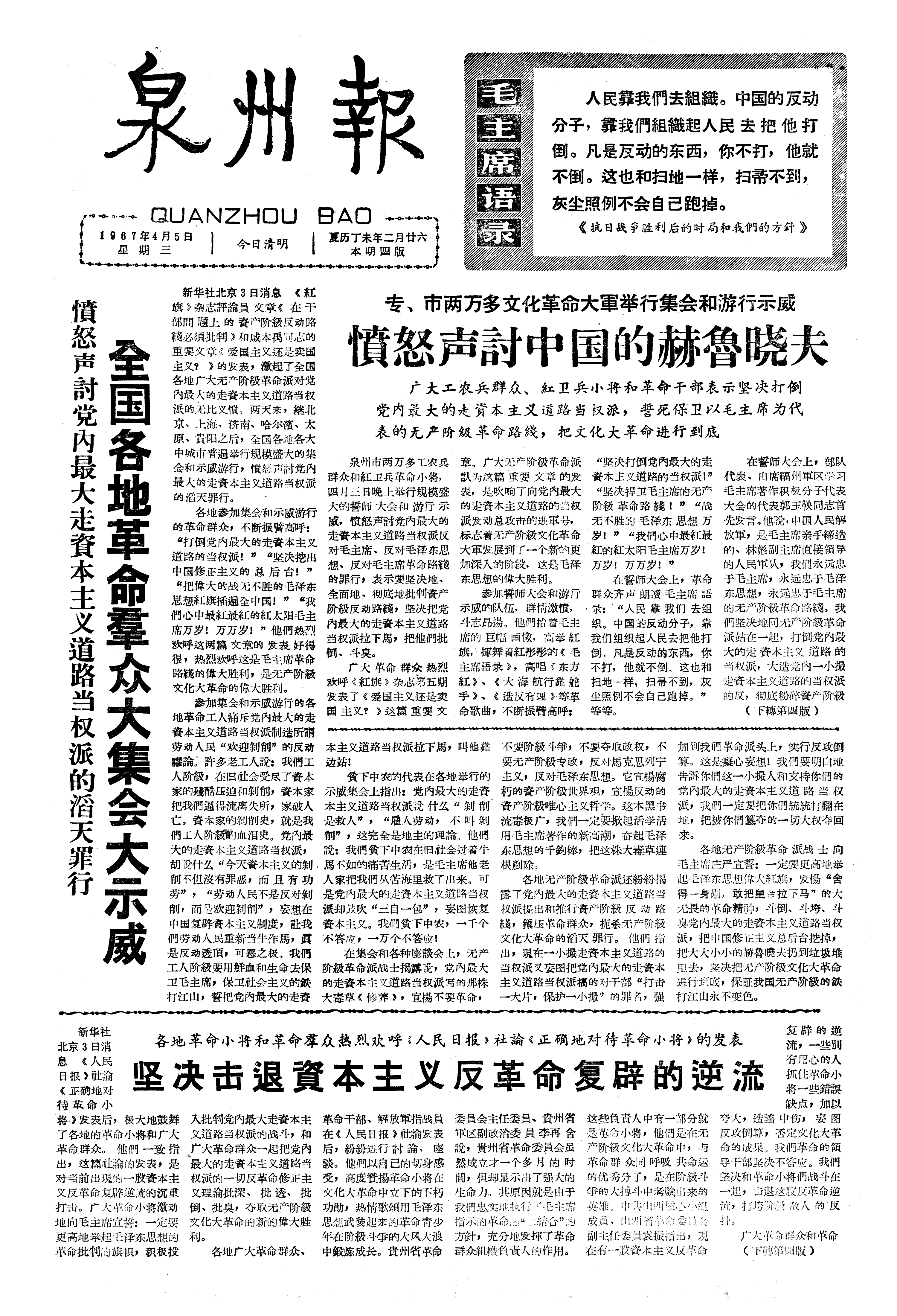 专、市两万多文化革命大軍举行集会和游行示威 憤怒声討中国的赫魯晓夫 广大工农兵群众、紅卫兵小将和革命干部表示坚决打倒党内最大的走資本主义道路当权派,誓死保卫以毛主席为代表的无产阶級革命路綫,把文化大革命进行到底