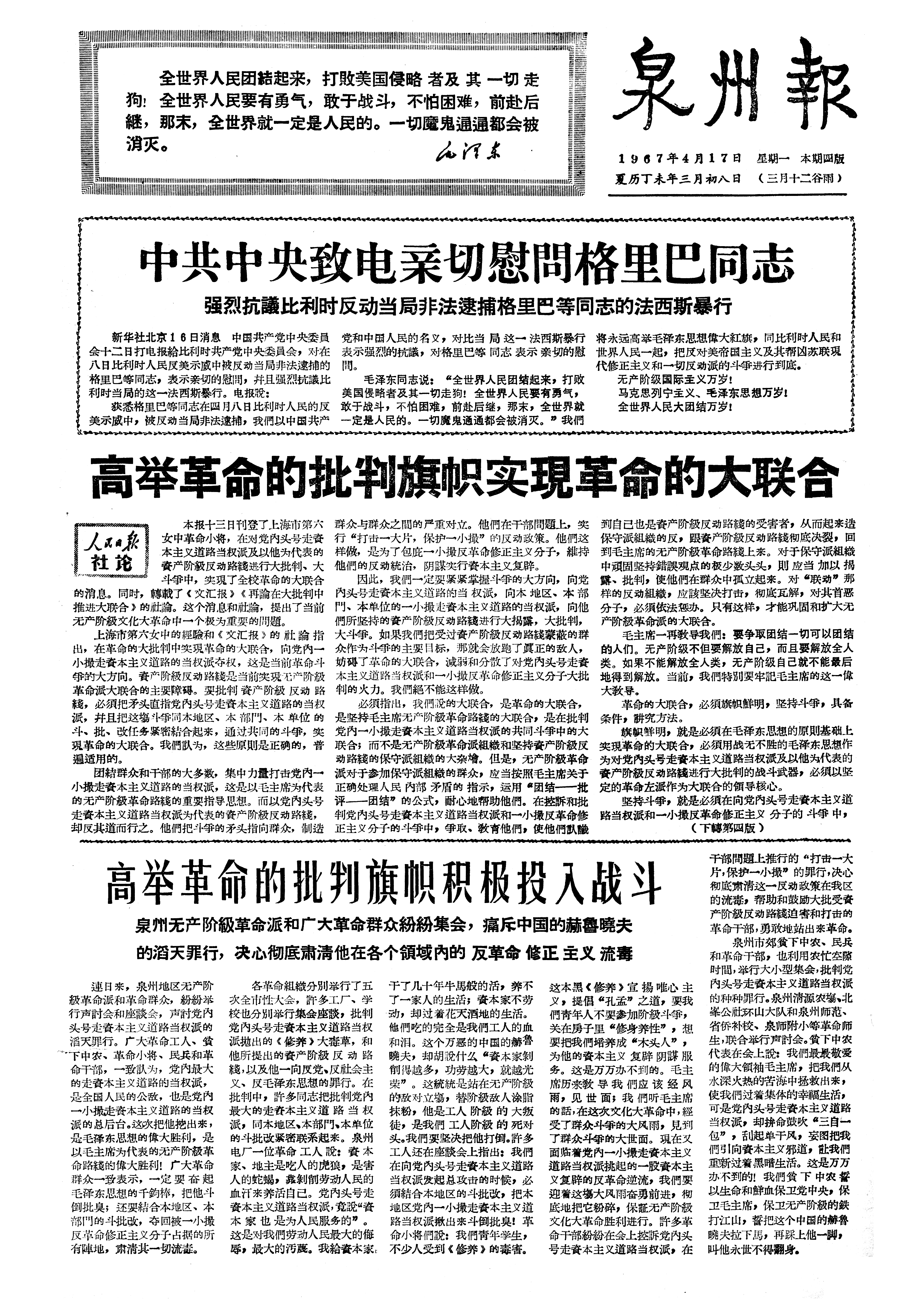 高举革命的批判旗帜积极投入战斗 泉州无产阶級革命派和广大革命群众紛紛集会,痛斥中国的赫魯曉夫的滔天罪行,决心彻底肃淸他在各个領域內的反革命修正主义流毒