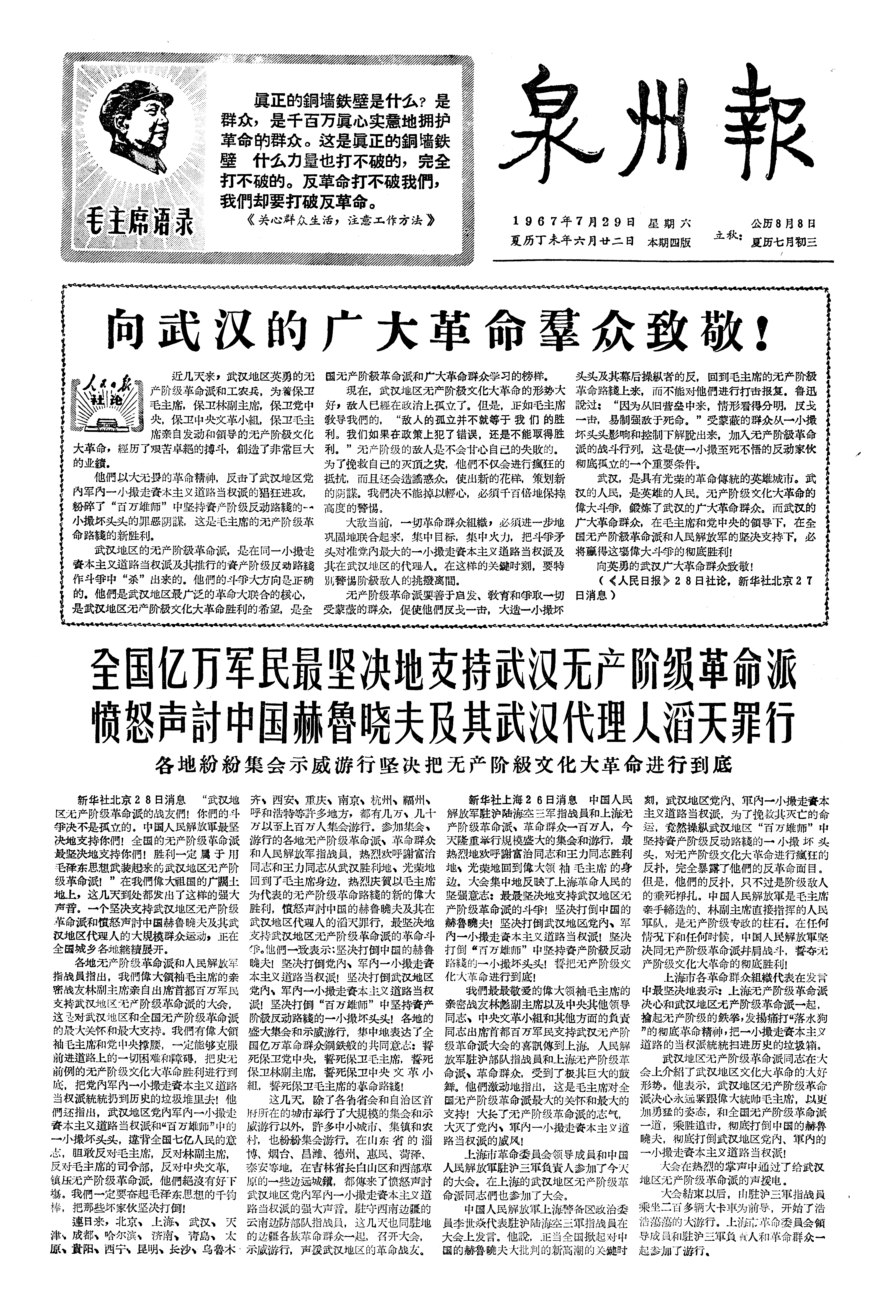 全国亿万军民最坚决地支持武汉无产阶级革命派愤怒声討中国赫魯晓夫及其武汉代理人滔天罪行 各地紛紛集会示威游行坚决把无产阶級文化大革命进行到底