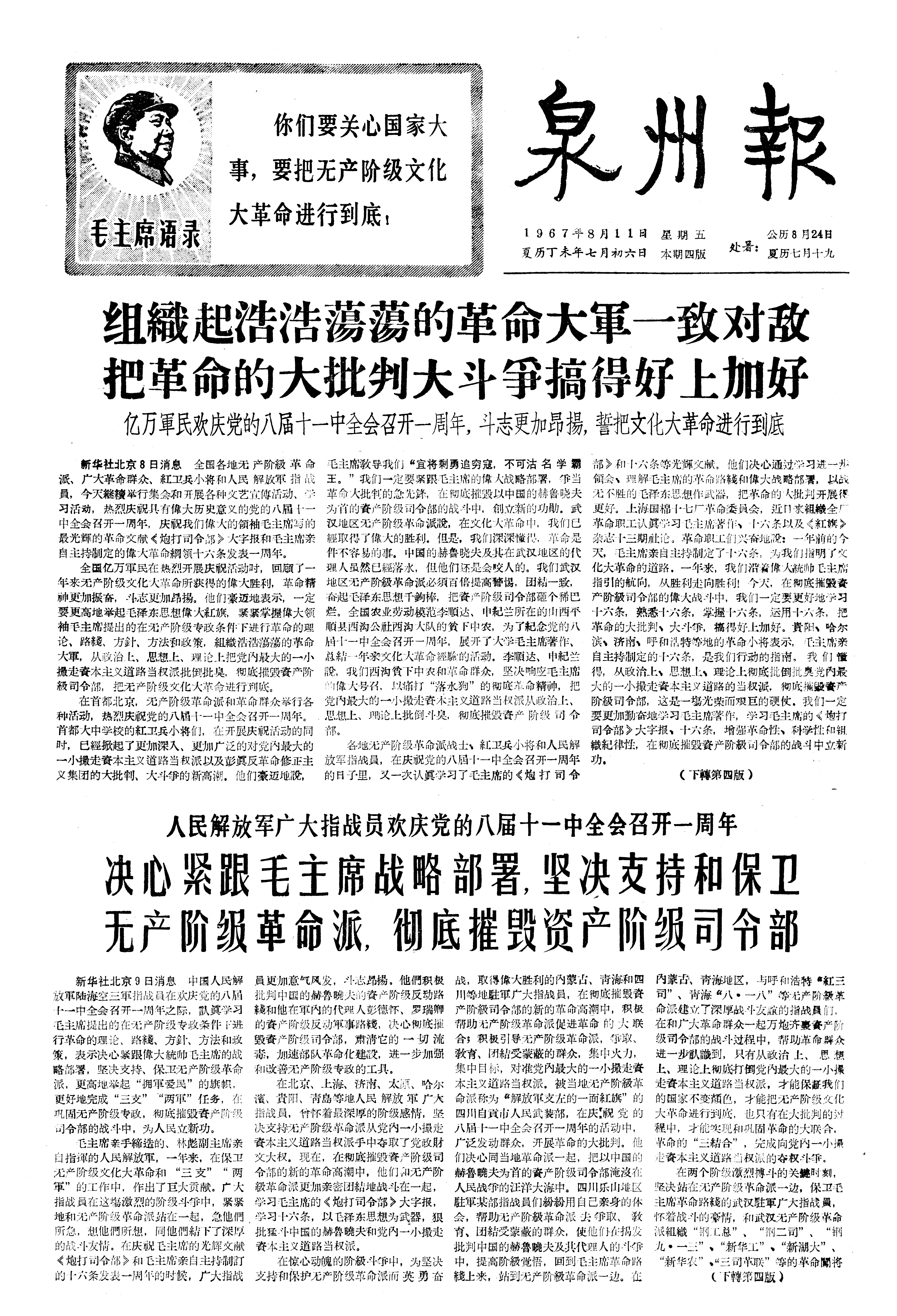 人民解放军广大指战员欢庆党的八届十一中全会召开一周年 决心紧跟毛主席战略部署,坚决支持和保卫无产阶级革命派,彻底摧毁资产阶级司令部