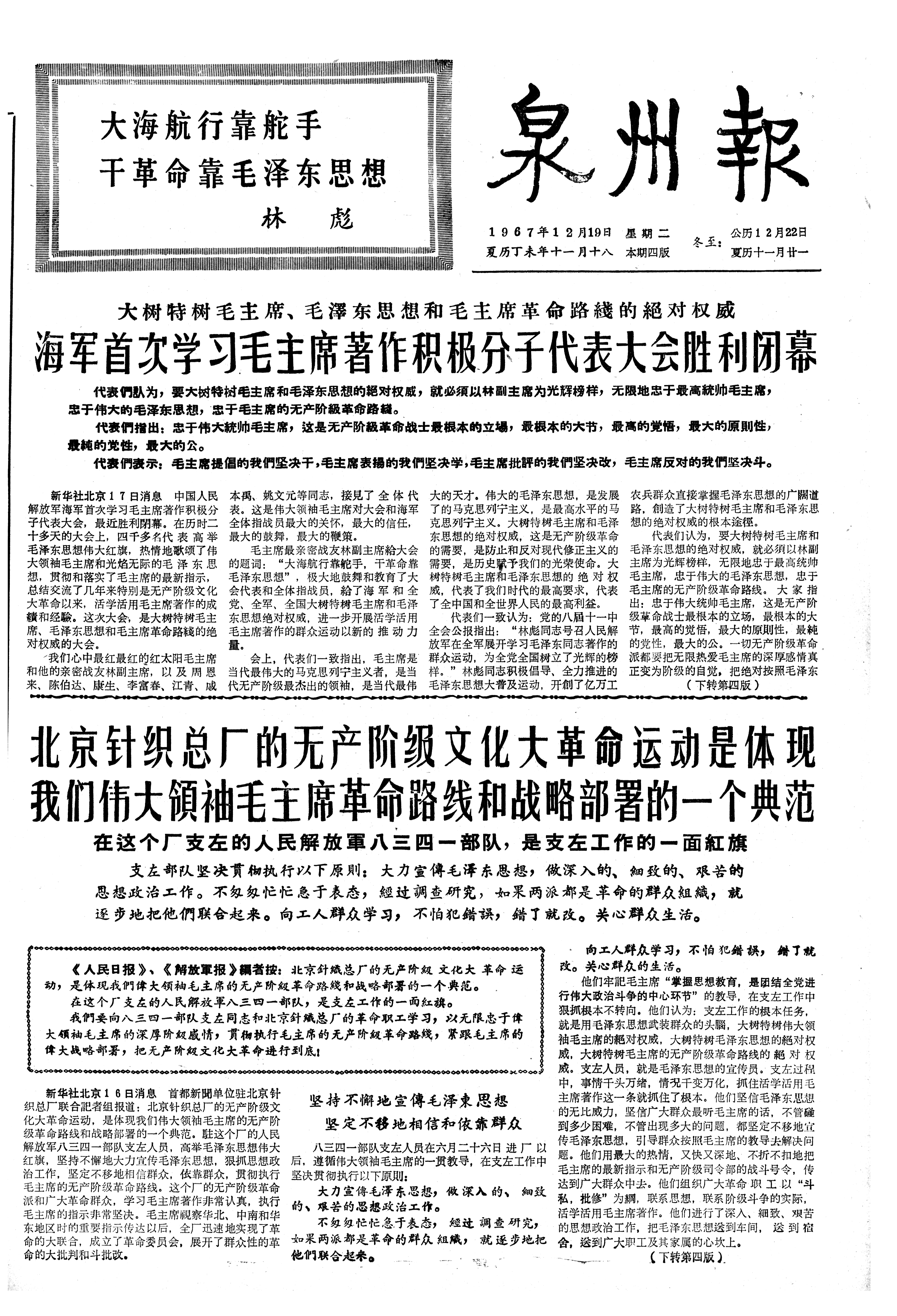 北京针织总厂的无产阶级文化大革命运动是体现我们伟大領袖毛主席革命路线和战略部署的一个典范 在这个厂支左的人民解放軍八三四一部队,是支左工作的一面紅旗