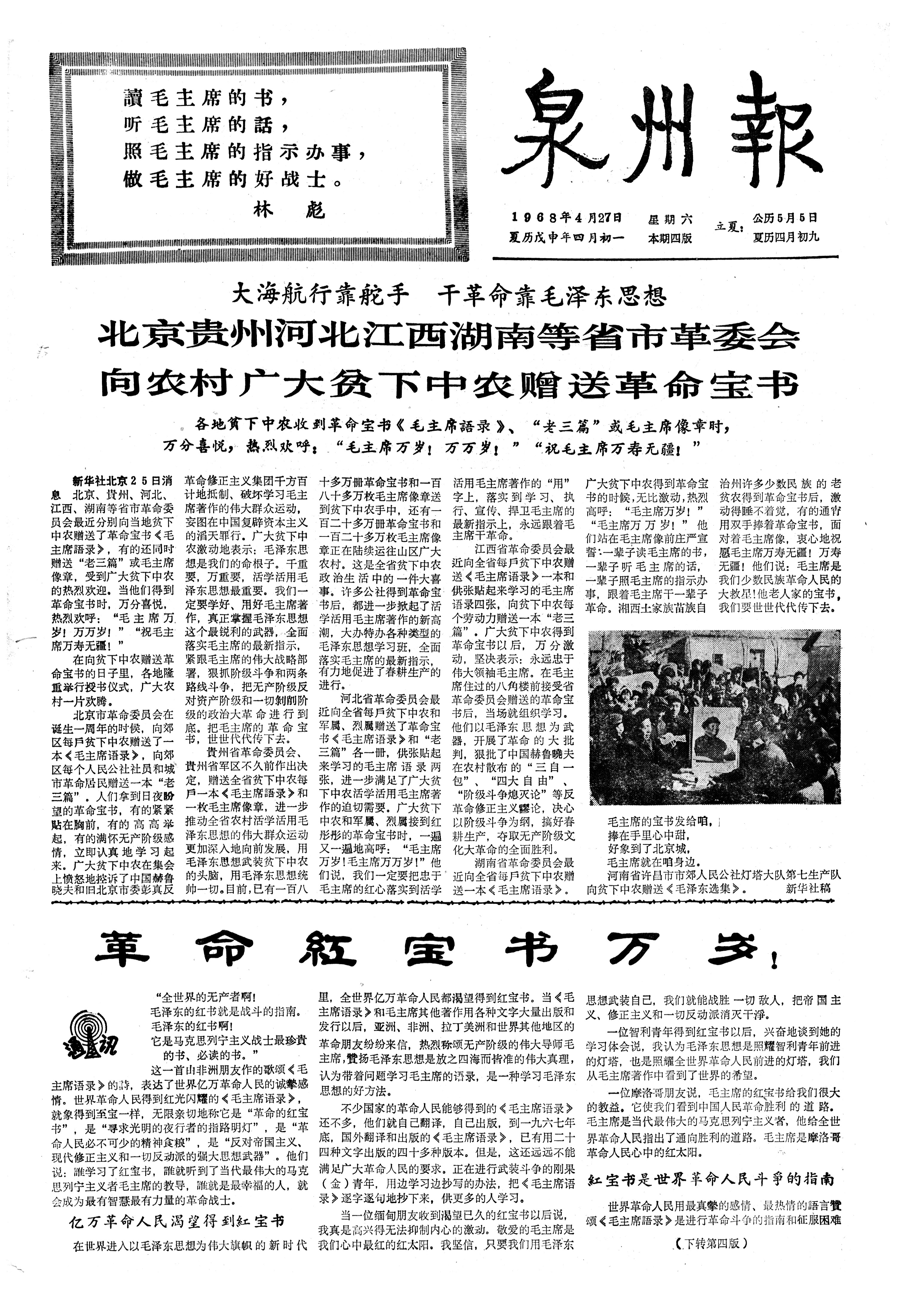 大海航行靠舵手 干革命靠毛泽东思想 北京贵州河北江西湖南等省市革委会向农村广大贫下中农赠送革命宝书 各地貧下中农收到革命宝书《毛主席語录》、“老三篇”或毛主席像章时,万分喜悦,热烈欢呼:“毛主席万岁!万万岁!”“祝毛主席万寿无疆!”