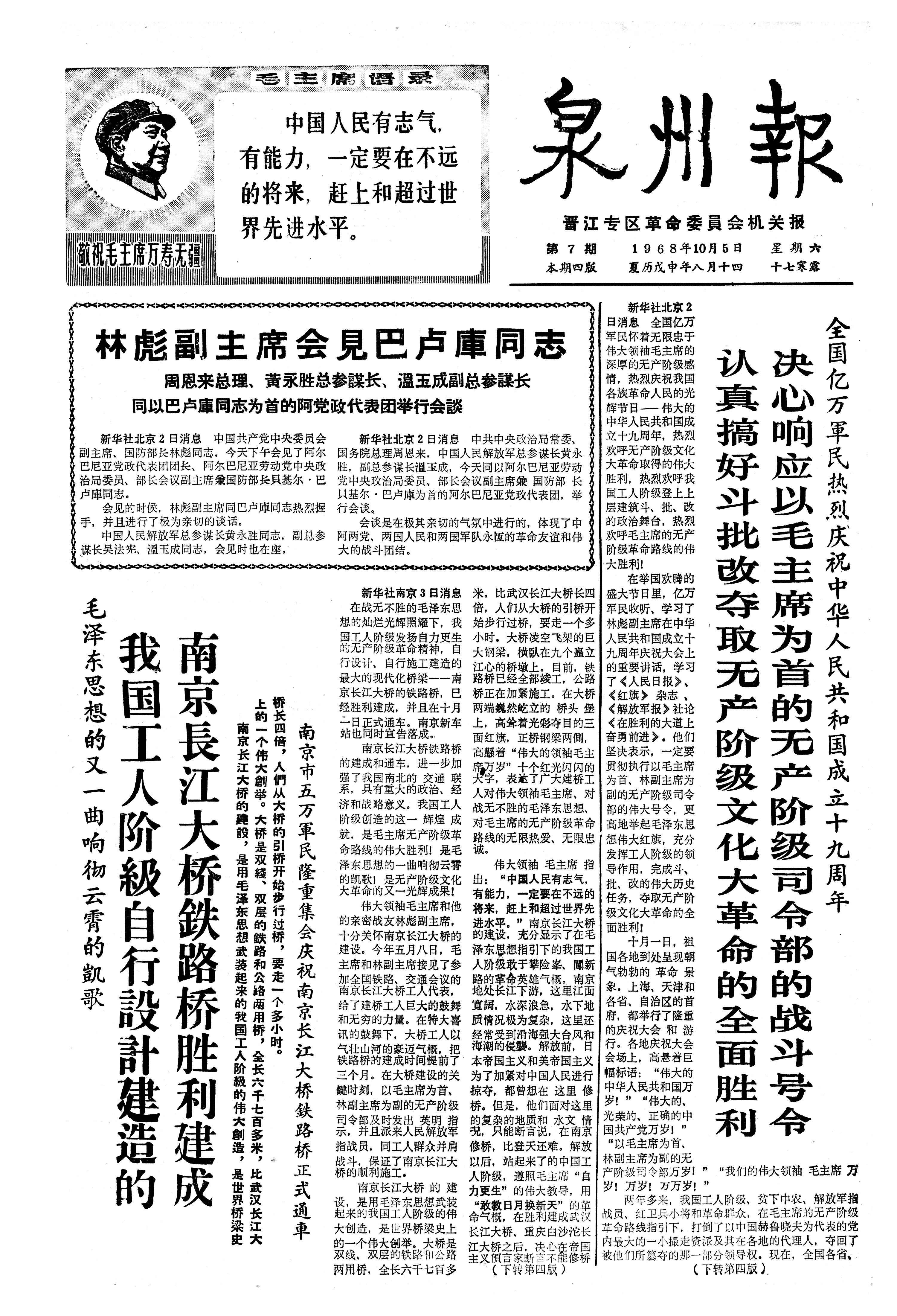全国亿万軍民热烈庆祝中华人民共和国成立十九周年 认真搞好斗批改夺取无产阶级文化大革命的全面胜利决心响应以毛主席为首的无产阶级司令部的战斗号令