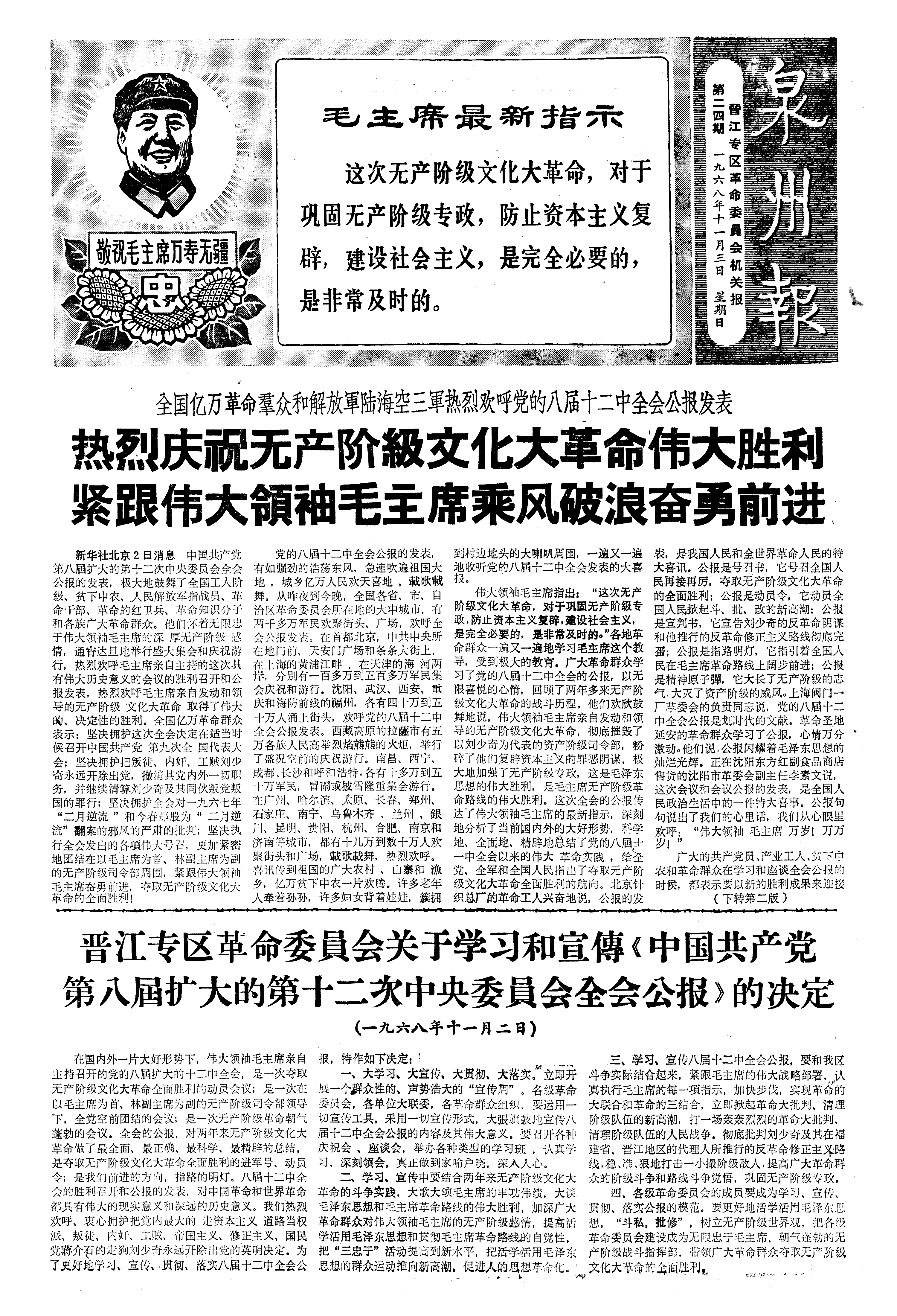 晋江专区革命委員会关于学习和宣傳《中国共产党第八屆扩大的第十二次中央委員会全会公报》的决定 (一九六八年十一月二日)