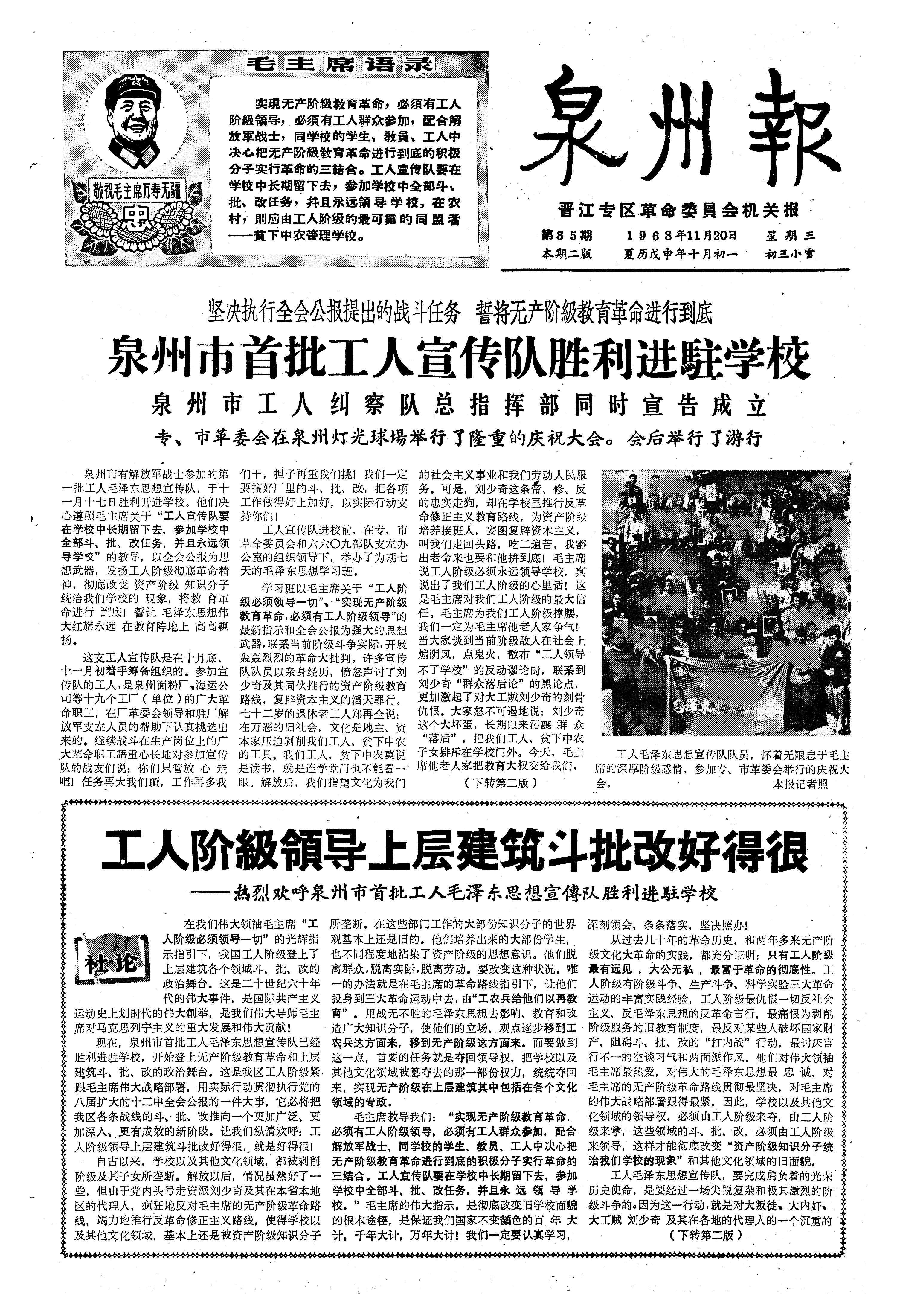 坚决执行全会公报提出的战斗任务 誓将无产阶級教育革命进行到底 泉州市首批工人宣传队胜利进駐学校 泉州市工人纠察队总指挥部同时宣告成立专、市革委会在泉州灯光球場举行了隆重的庆祝大会。会后举行了游行