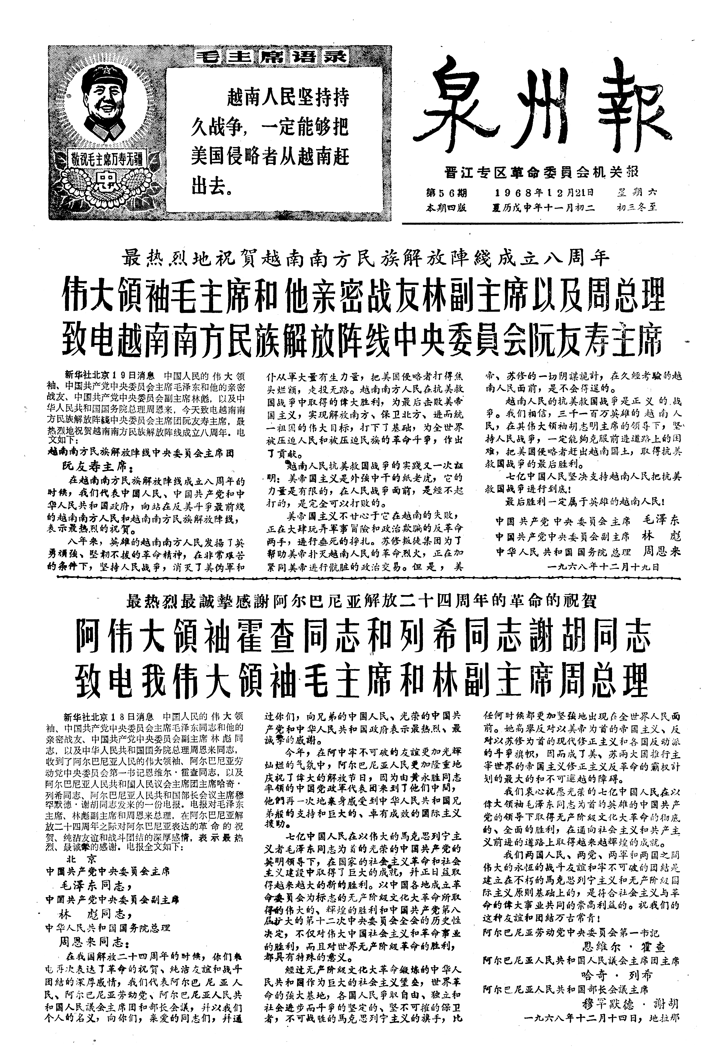 最热烈最誠摯感謝阿尔巴尼亚解放二十四周年的革命的祝賀 阿伟大領袖霍查同志和列希同志謝胡同志致电我伟大領袖毛主席和林副主席周总理
