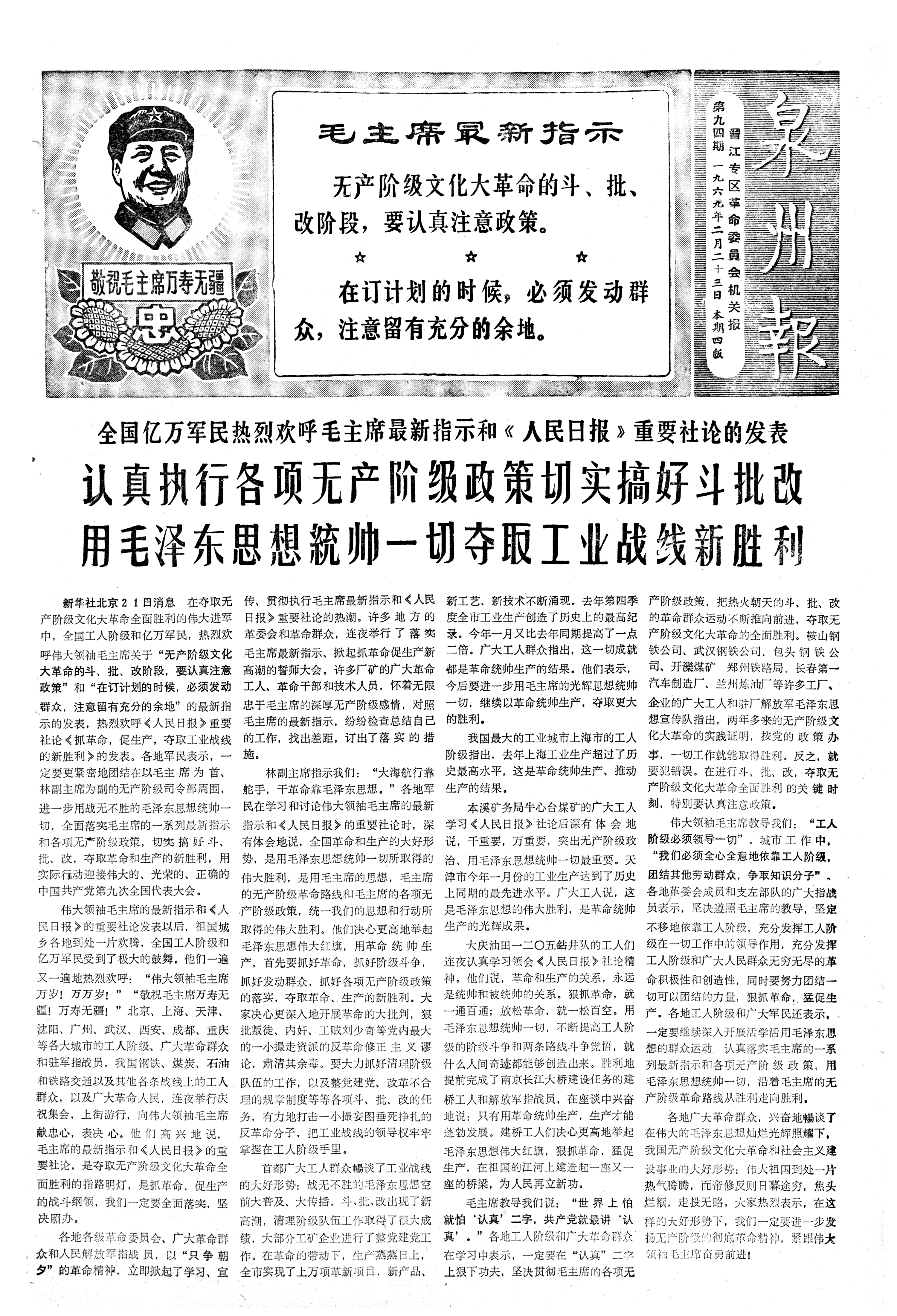 全国亿万军民热烈欢呼毛主席最新指示和《人民日报》重要社论的发表 认真执行各项无产阶级政策切实搞好斗批改用毛泽东思想統帅一切夺取工业战线新胜利