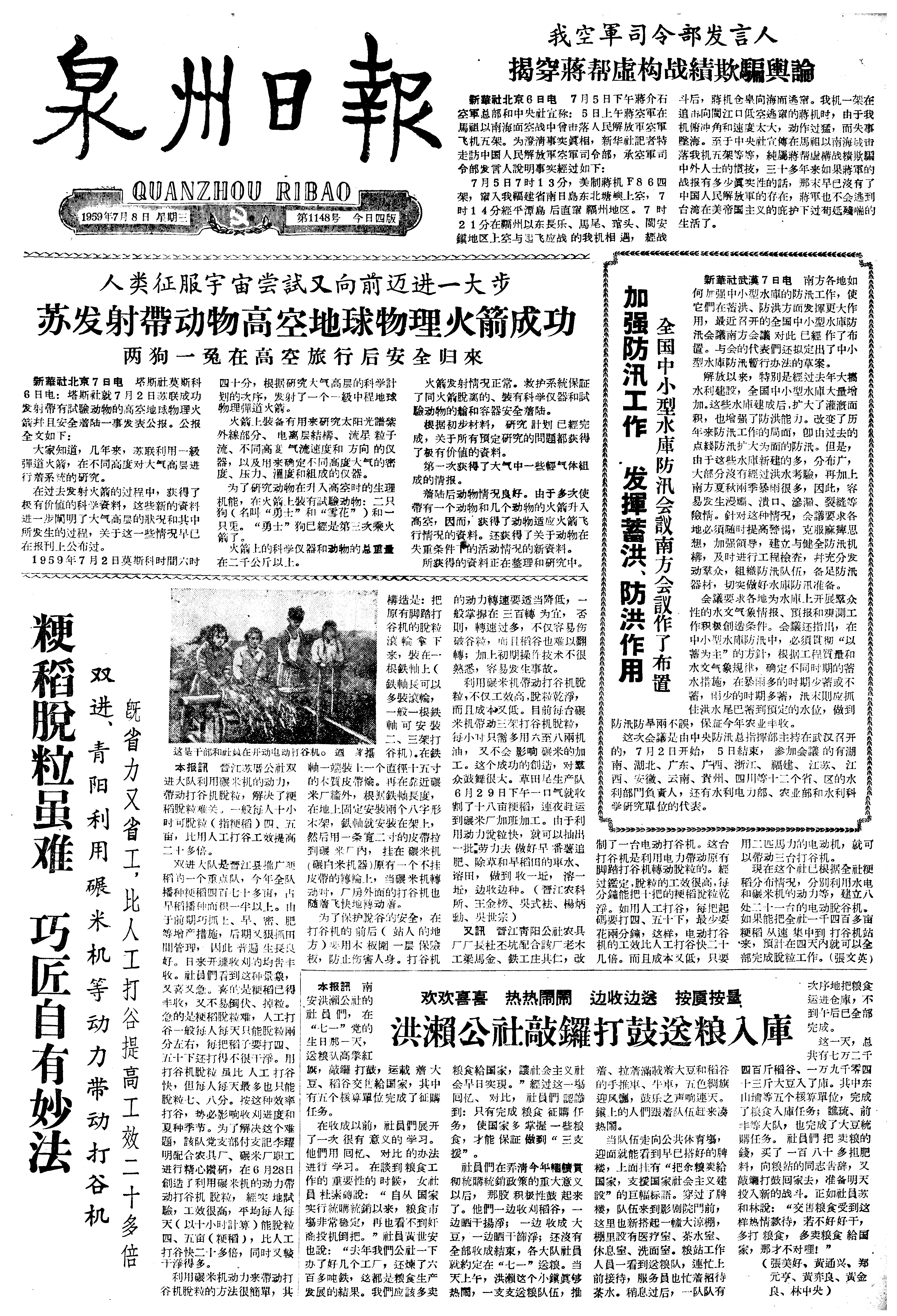 人类征服宇宙尝試又向前迈进一大步 苏发射帶动物高空地球物理火箭成功 两狗一兔在高空旅行后安全归來
