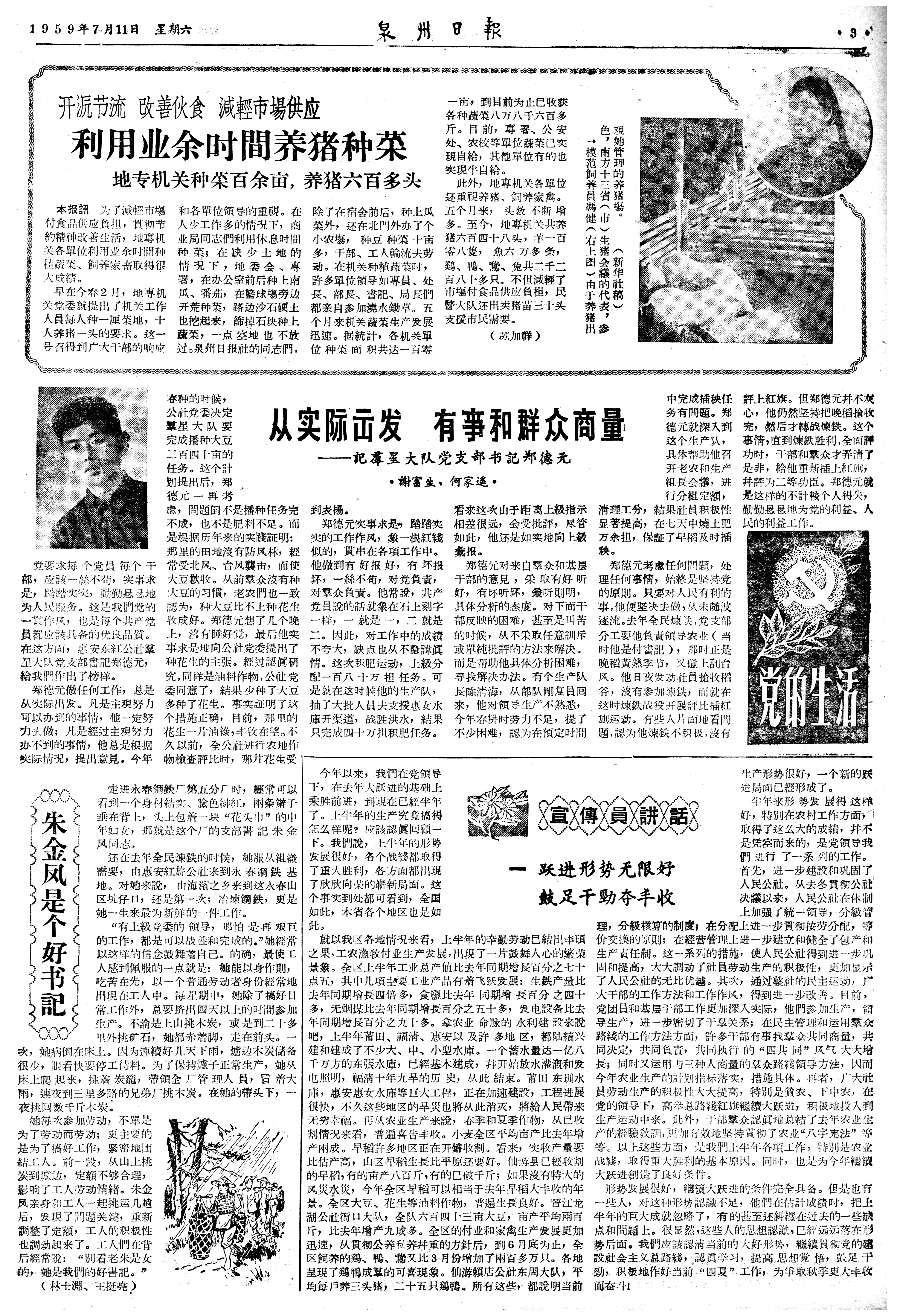 开□节流攺善伙食減輕巿場供应 利用业余时間养猪种菜 地专机关种菜百余亩,养猪六百多头