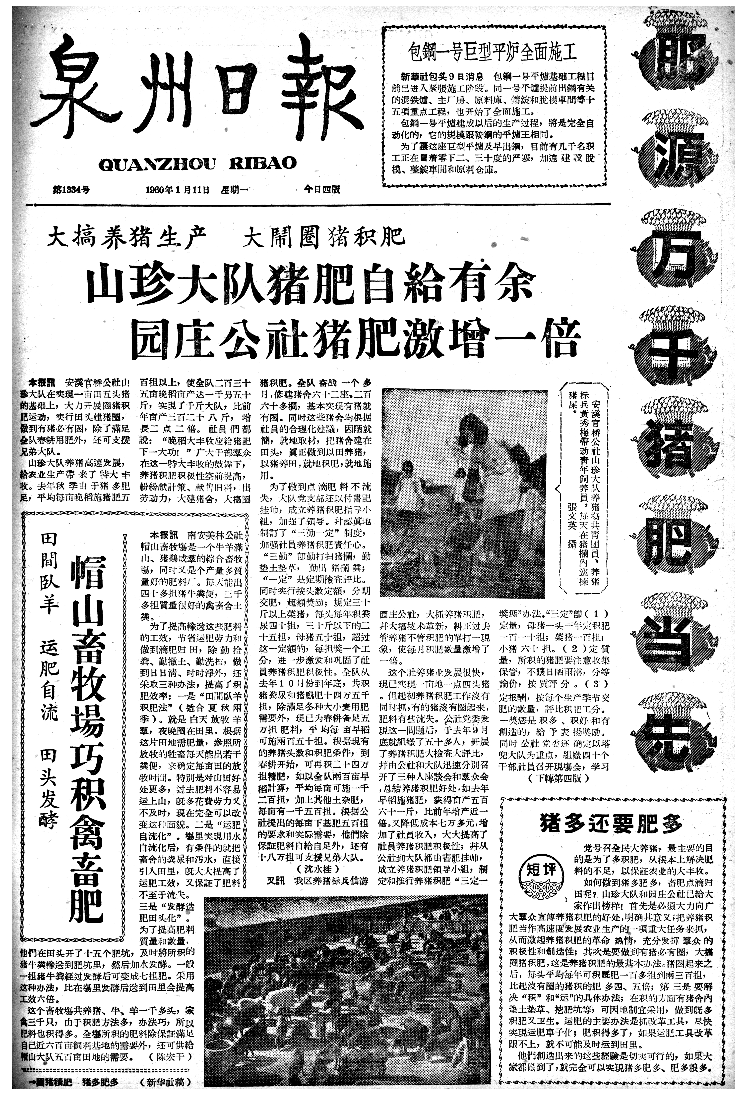 大搞养猪生产 大鬧圈猪积肥 山珍大队猪肥自給有余 园庄公社猪肥激增一倍