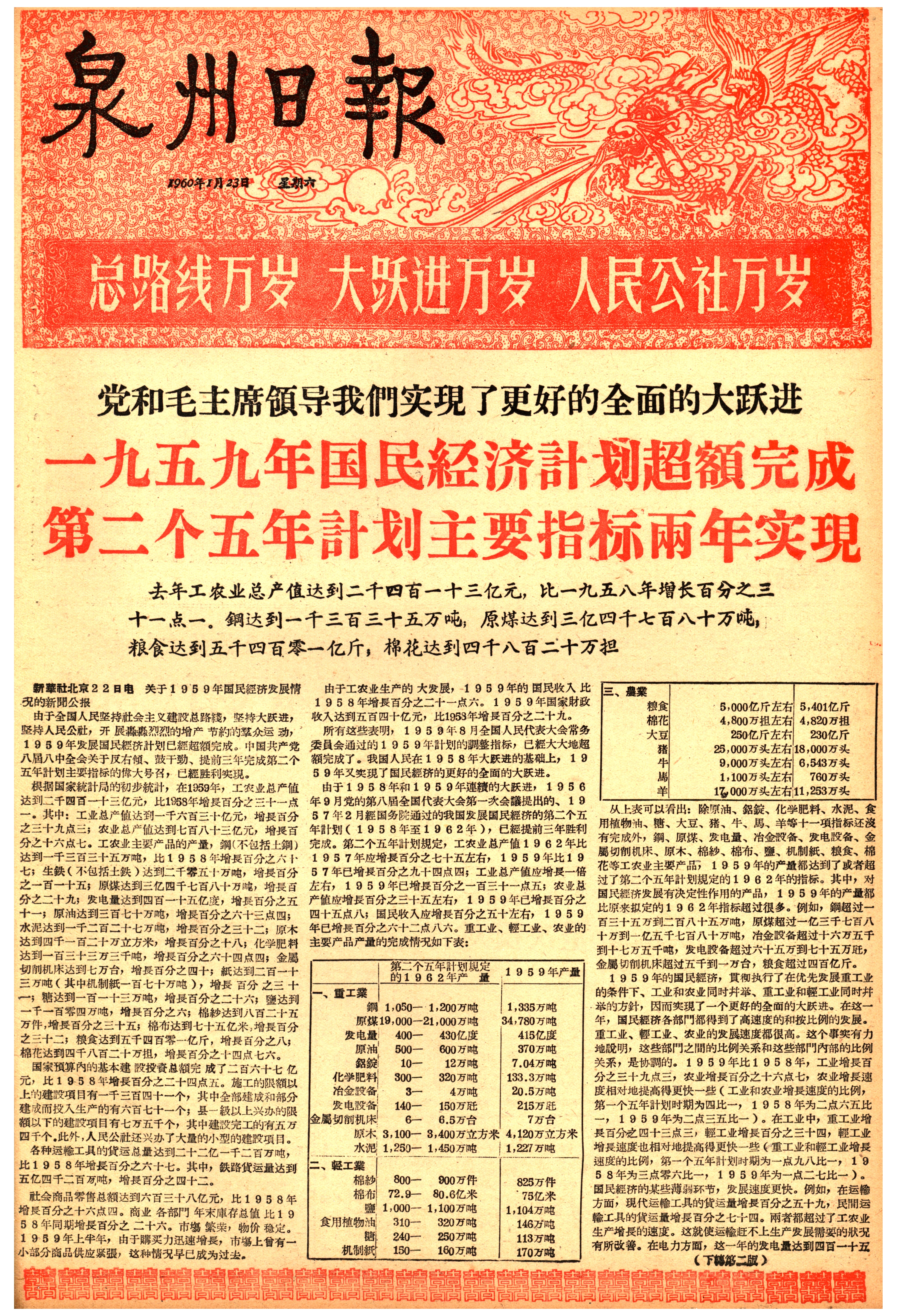党和毛主席領导我們实現了更好的全面的大跃进 一九五九年国民經济計划超額完成第二个五年計划主要指标兩年实現 去年工农业总产值达到二千四百一十三亿元,比一九五八年増长百分之三十一点一。鋼达到一千三百三十五万吨;原煤达到三亿四千七百八十万吨;粮食达到五千四百零一亿斤;棉花达到四千八百二十万担