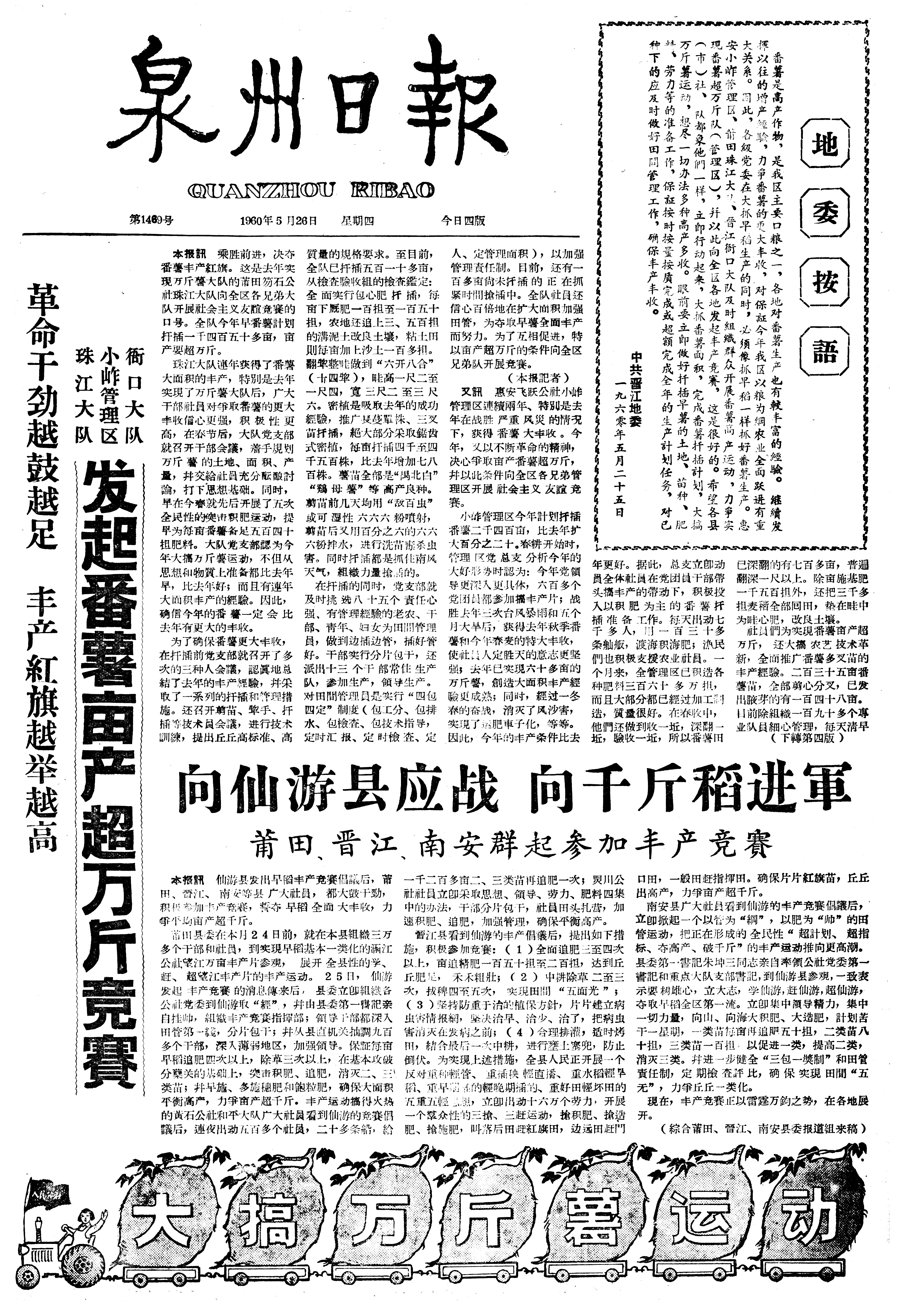 革命干劲越鼓越足 丰产紅旗越举越高 珠江大队小岞管理区衙口大队发起番薯亩产超万斤竞賽