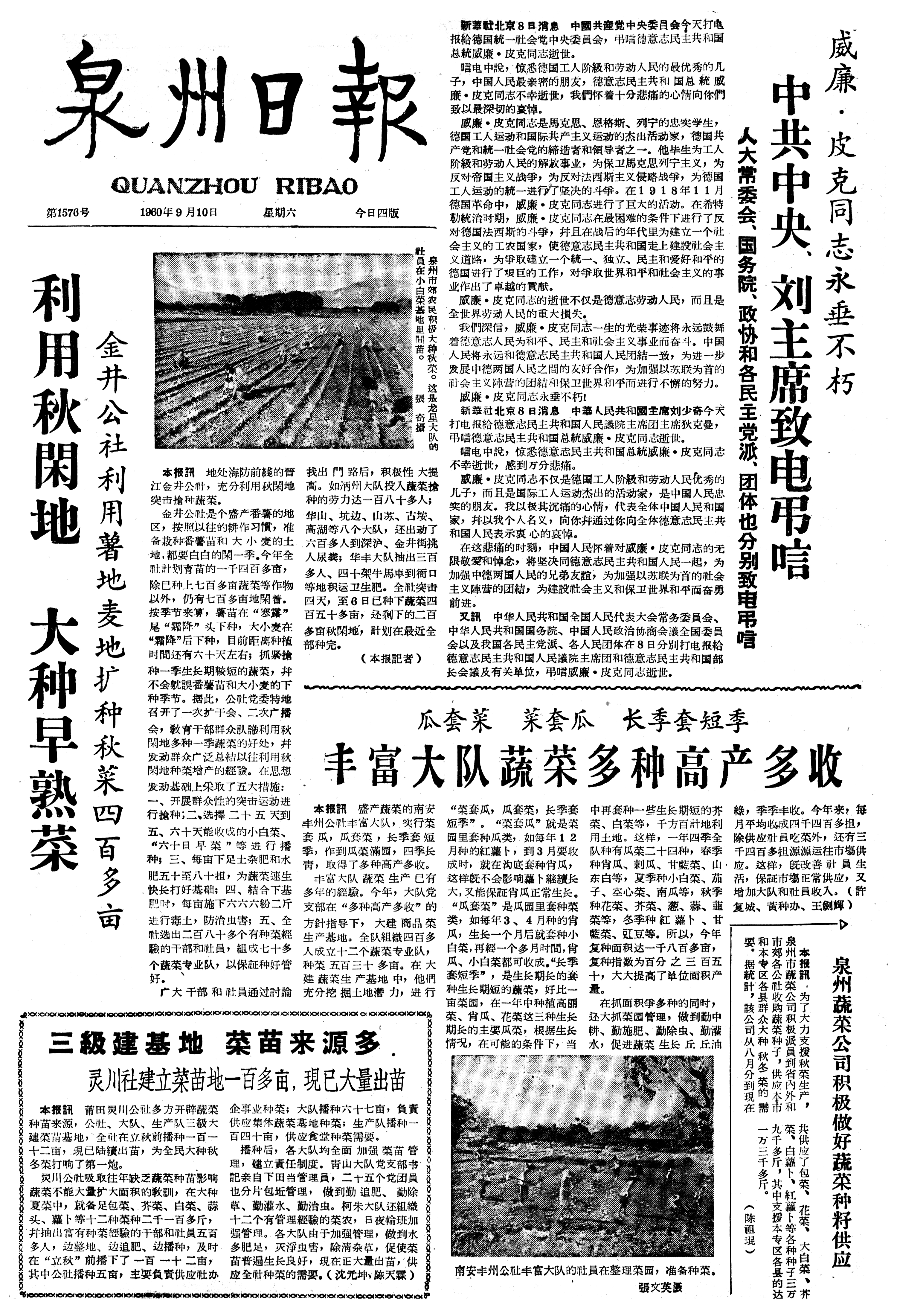 威廉·皮克同志永垂不朽 中共中央、刘主席致电弔唁 人大常委会、国务院、政协和各民主党派、团体也分别致电弔唁