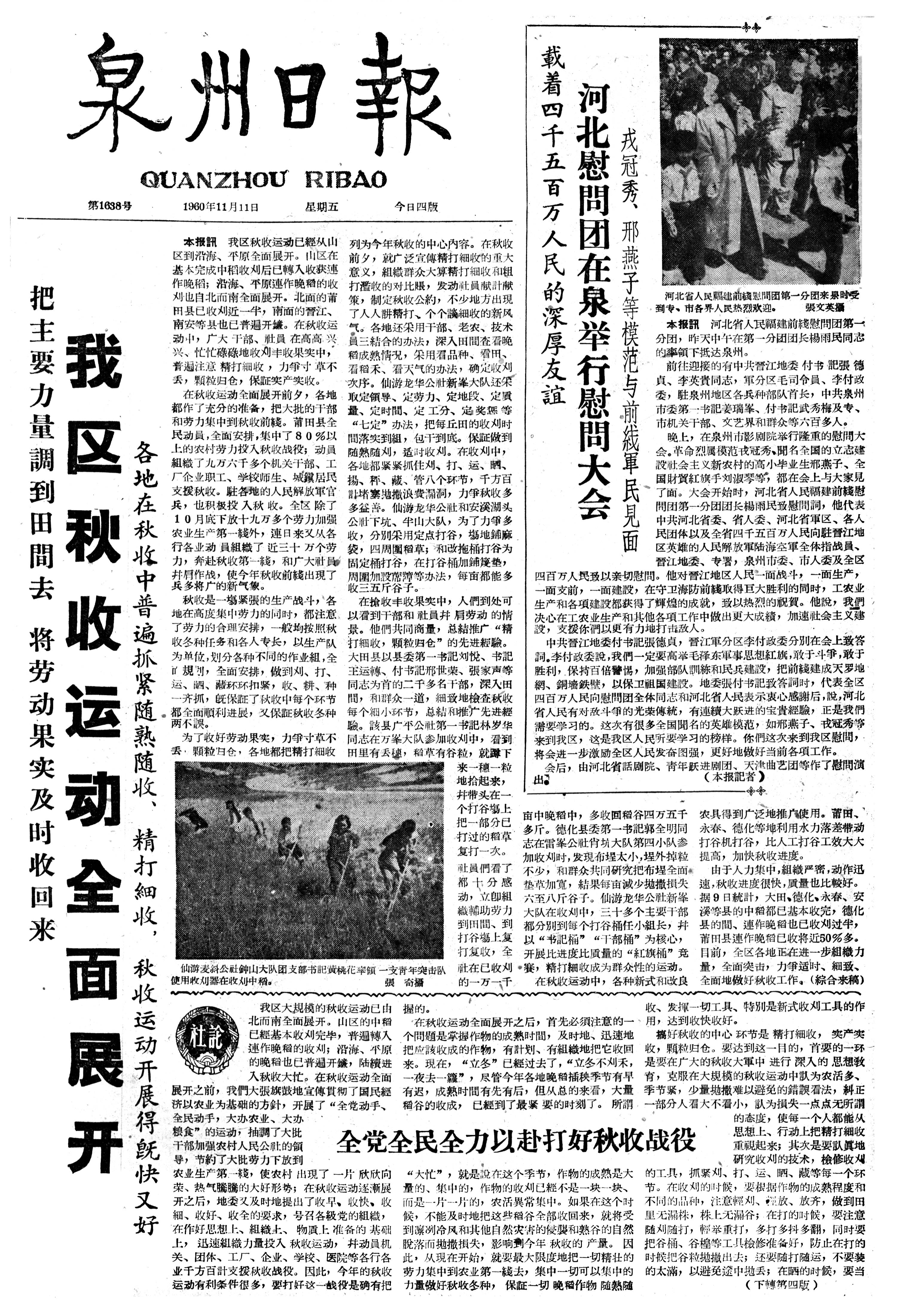 把主要力量調到田間去 将劳动果实及时收回来 我区秋收运动全面展开 各地在秋收中普遍抓紧随熟随收、精打細收,秋收运动开展得旣快又好