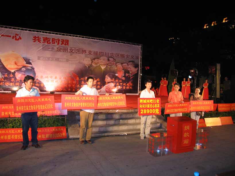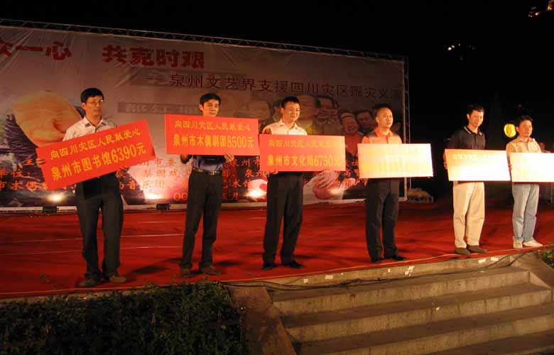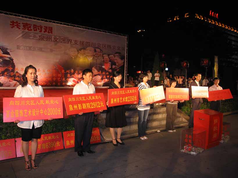 泉州市委宣传部、泉州市文化局和泉州晚报社共同主办的“万众一心  共克时艰——泉州市文艺界支援四川灾区赈灾义演”16日晚上在市区府文庙广场举行,赈灾义演现场一幕幕感人的场景再一次传递了爱的福音,此次义演共募集爱心款近27万元。市人大常委会副主任陈家富,市政协副主席陈元殿和主办单位的领导到场观看演出并带头捐款。