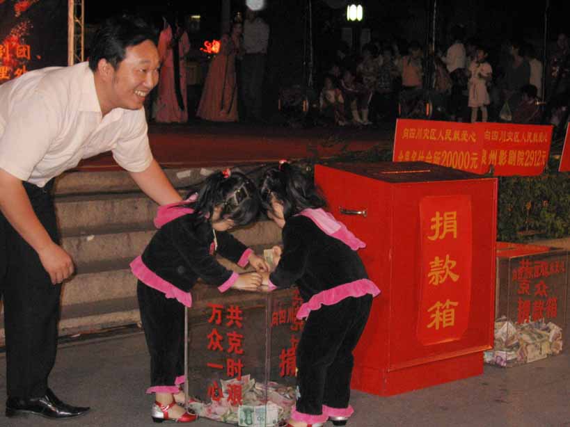 义演现场爱心如潮。市文化局、市文物局、泉州艺术学校、省梨园实验剧团、泉州歌剧团等文化系统单位共发动员工捐献9万多元。得知此次赈灾义演活动后,我市有近10家企业到场参与活动,其中丰泽皇都娱乐城捐献5万元,金泉名仕会所、福建省万荣网吧连锁公司和宏泰兴交通发展有限公司各捐献2万元,中闽百汇总经理陈开通和泉州百合服饰艺术设计中心设计师陈思萱分别以个人名义捐献了5000元和2000元。