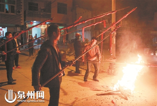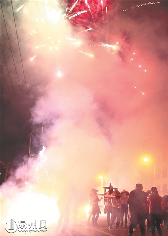 此时,村里每家每户都已准备了数串鞭炮,并把它们缠绕在长约4米的竹竿上,等佛像走到自家门口时,便点燃鞭炮,伸到“赵大天君”身上去。