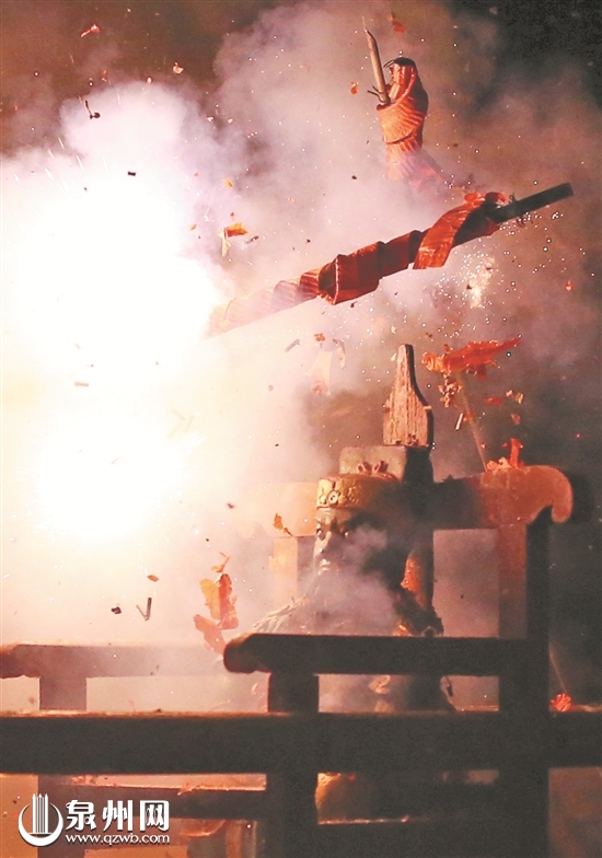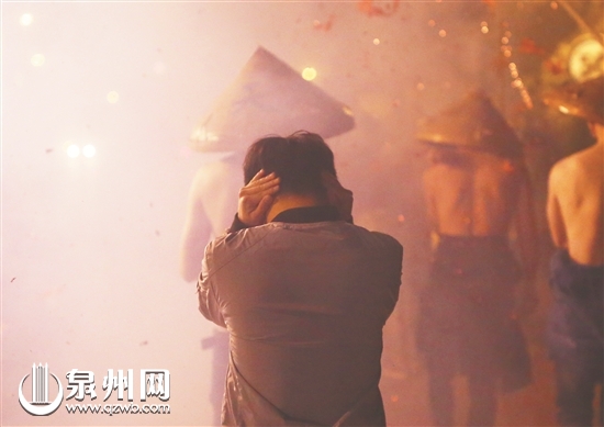 泉州网2月27日讯 (记者陈玲红 王柏峰 吴嘉晓 文/图)小伙子赤裸上身抬着佛像,五六串长达数米的鞭炮在佛像身上、小伙子身边炸开。幸运的话,佛像的“胡须”会被炸掉,小伙子的身上却一点不觉得疼。很奇妙吧?这是被称为“达埔三奇”“八闽第一奇”的永春达埔镇岩峰村的“走火把”,当地人更喜欢称它为“炸佛”。