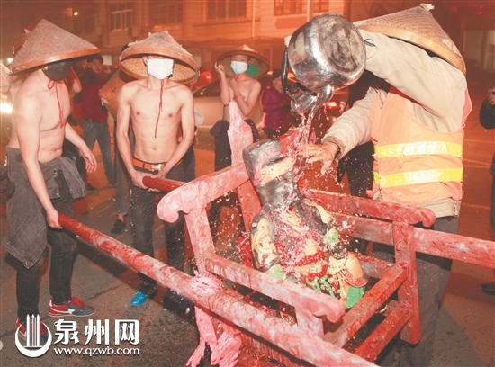 昨天晚上的活动省去巡游环节,直接“炸佛”。“炸佛”时由四名赤裸上身的男子抬轿。佛像一到,村里的大人小孩便举起竹竿,争相“炸佛”。“最好能炸了天君的胡须,祈福消灾,添丁旺财最吉利。”村民李先生说。