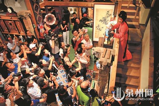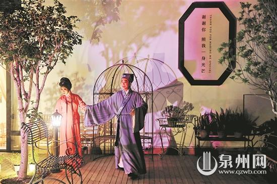 异域风情的“唐人街”里,飘过婀娜身段;闽南风韵的“候花厅”里,响起曼妙吟唱;现代小汽车旁,两个古装男女不紧不慢上演风趣情爱故事;丝竹锣鼓声中,一群时尚观众如痴如醉地边看边跟着演员过桥入窑……